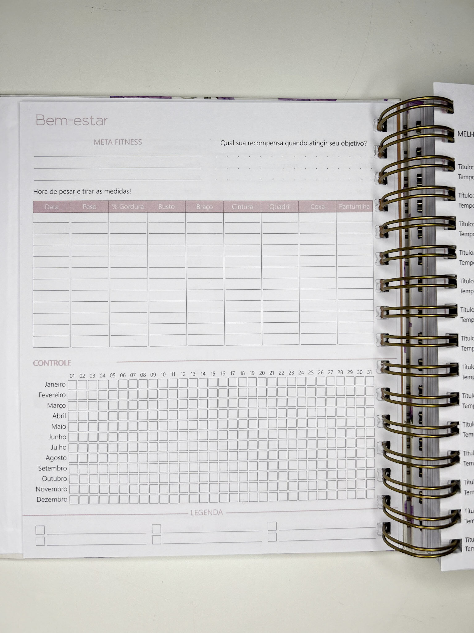 - 10 páginas (5 folhas) de anotações no fim do planner.